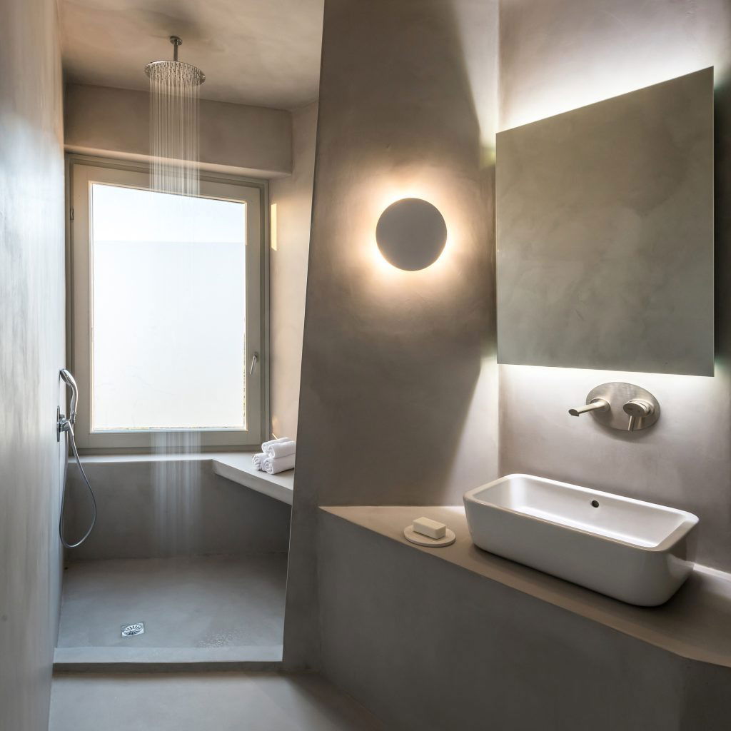 Microcimentul este extrem de popular în băi moderne datorită aspectului continuu și eliminării rosturilor.